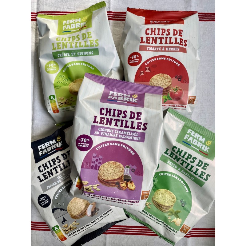 Saveur tomate & herbes : Les lentilles d'Hilaire (42,7%), fécule de pomme de terre, huile de tournesol, mix "tomates et herbes" : sel, tomates (1%), sucre glace, paprika, oignon, paprika fumé, arômes naturels, herbes (0,2%) : basilic, persil, épice.